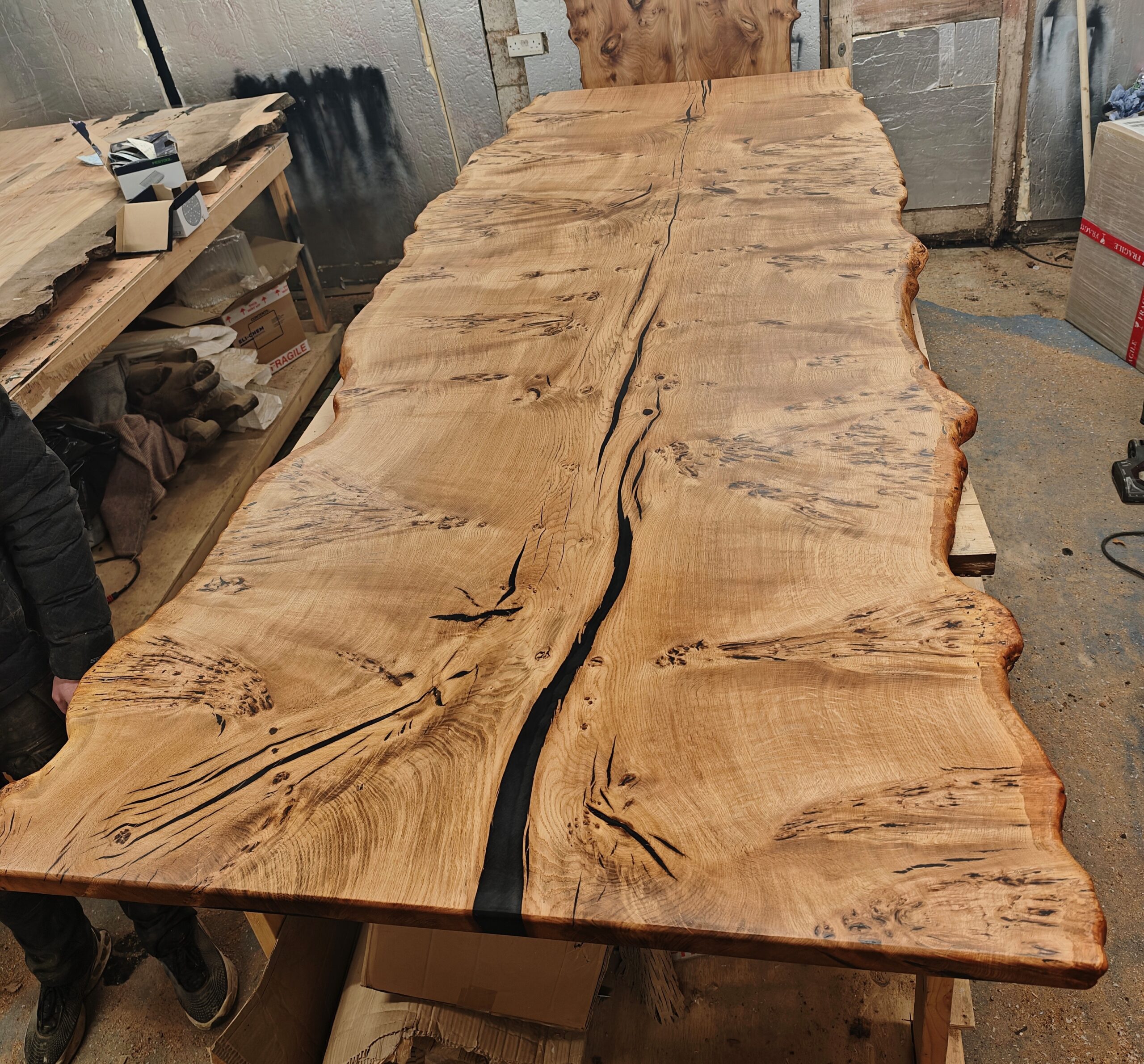 For the truly discerning client, we can offer ultra-wide single slabs of rare Burr Oak, sometimes reaching over 1.5m in width. This allows us to craft a dining table between 1m and 1.5m wide from one continuous slab of solid Oak – no joins, just a breathtaking expanse of natural timber. Burr Oak is renowned for its dramatic character, full of swirling grain and intricate knots, which can be beautifully highlighted with resin infusion for the ultimate statement piece. These slabs are also exceptionally thick, often finishing at up to 60mm, giving the table a bold, luxurious presence that simply cannot be matched.