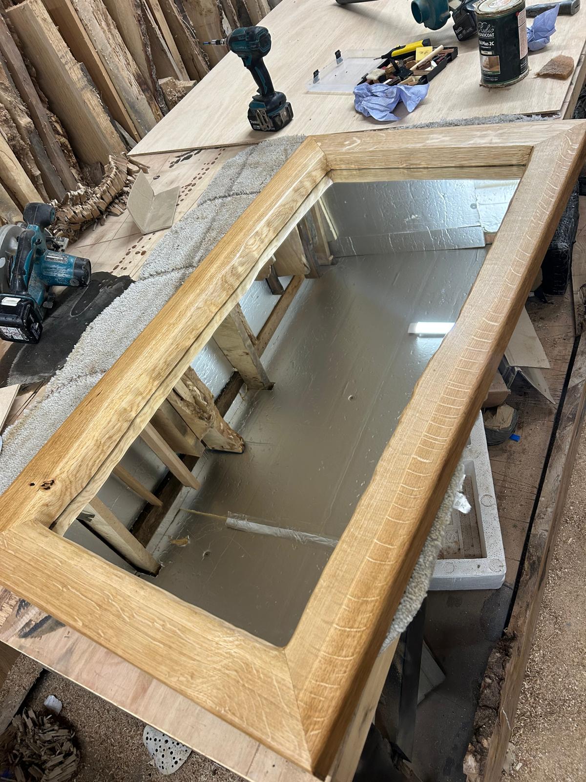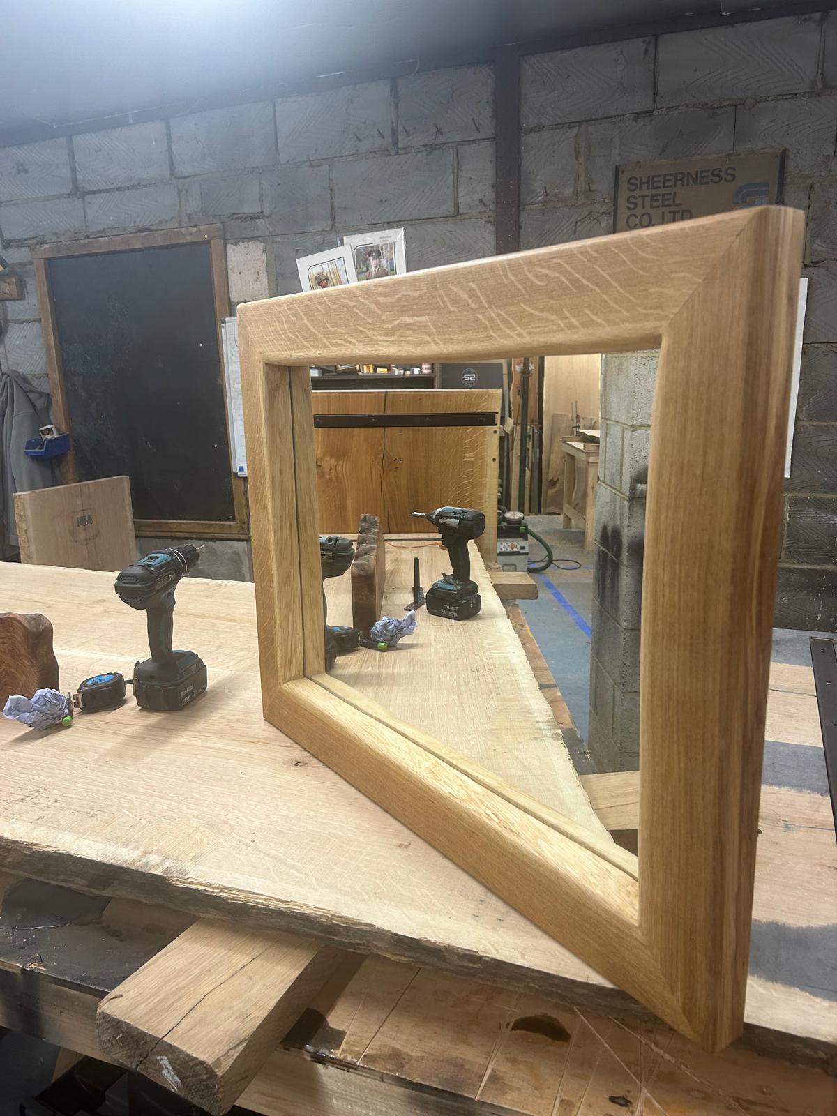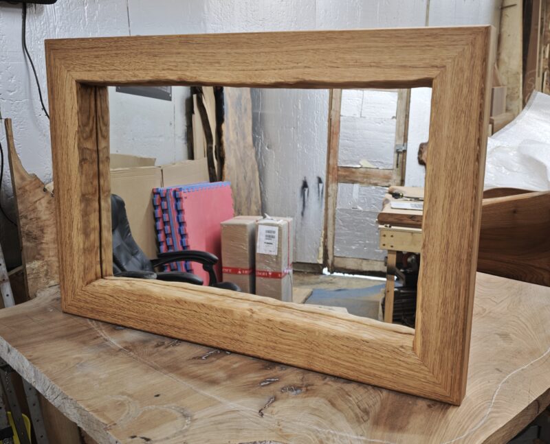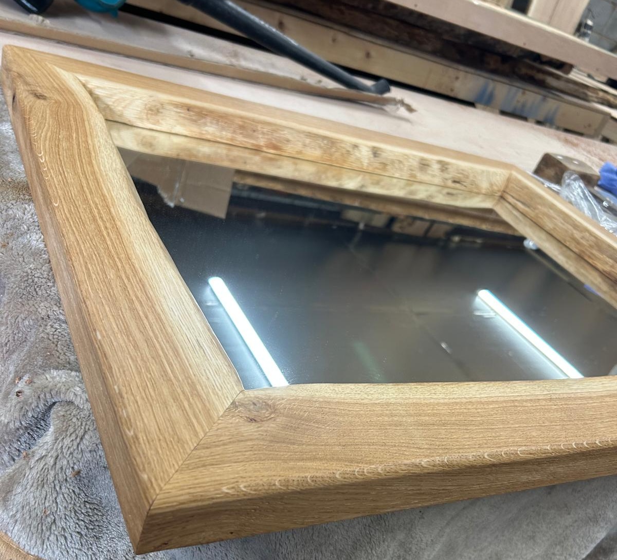 This is a beautiful custom made mirror, handcrafted in the UK, surrounded by live edge French Oak, with the straight edges on the outside and live edges on the inside.