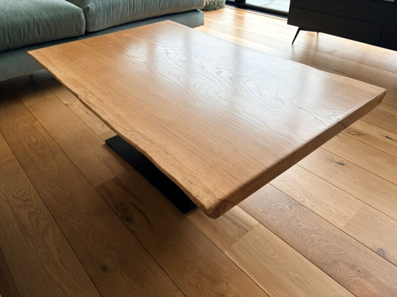 The Virelli Bookmatched French Oak Coffee Table – Handmade in the UK is crafted from two ultra-wide solid French oak slabs, approximately 48mm thick, seamlessly joined through the centre for perfect grain symmetry.