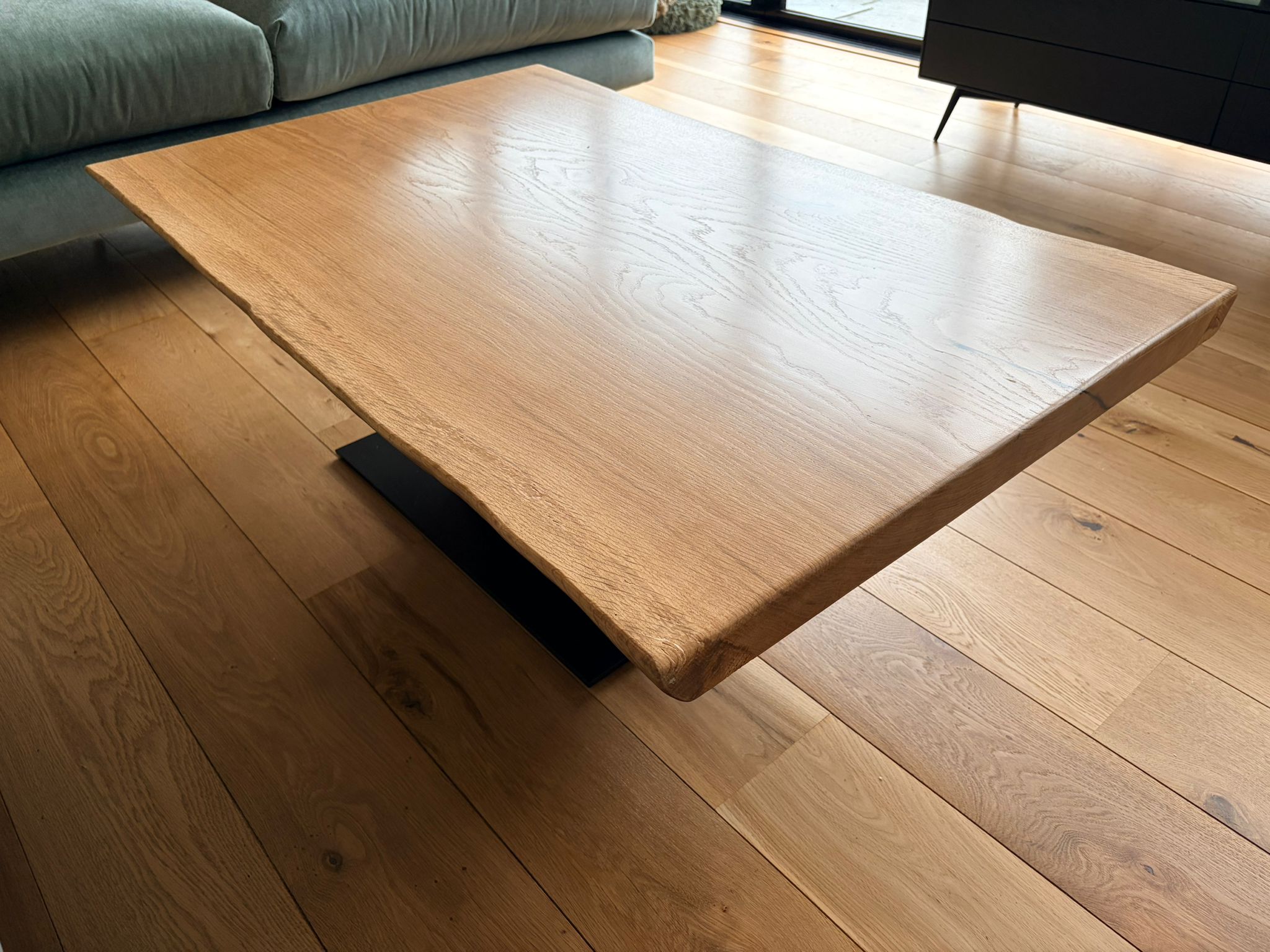 Introducing The Virelli Bookmatched French Oak Coffee Table, a bold architectural centrepiece handcrafted in our UK workshop from two ultra-wide bookmatched slabs of solid French oak, seamlessly joined through the centre for perfect symmetry and uninterrupted flowing grain patterns.
