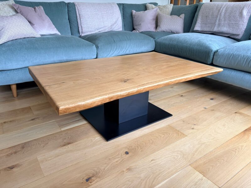 The contrast between the warm natural oak and the deep matte black steel creates a balanced and sophisticated centrepiece for modern interiors.